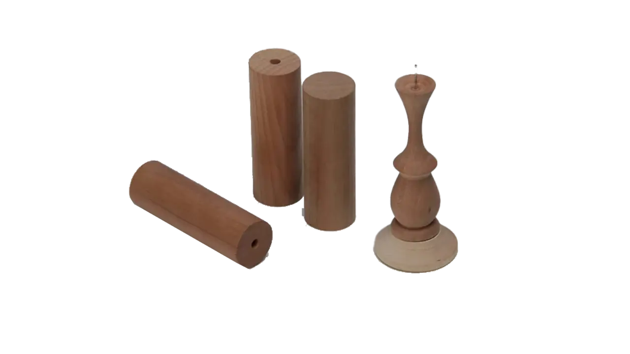 Trædyvler af valnøddetræ med centerhul for nemmere fastspænding.